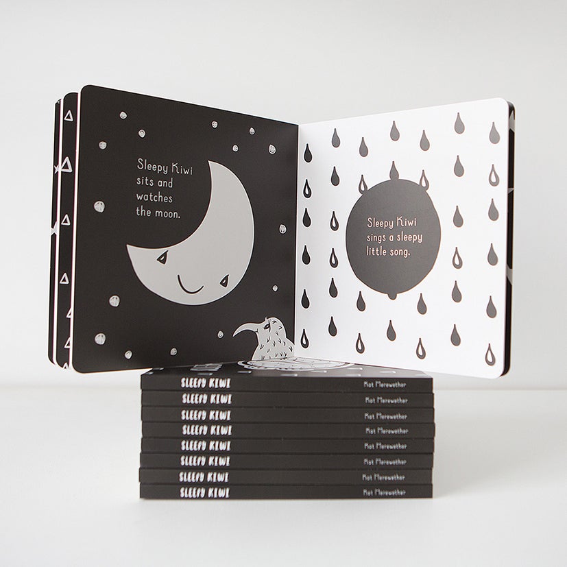 “Sleepy Kiwi is bold so even the youngest eyes can see him. His story is told through chunky black and white images that mesmerise babies right from birth.”
