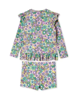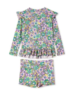 Retro Rash Set with UPF rating is the perfect set to be wearing for a day at the pool or beach. This sweet summer print in tones of pink, lilac & green on a sunshine yellow base, will have you ready for a summer’s day being active. For a complete outfit pair back with the Retro Swim Hat