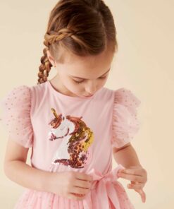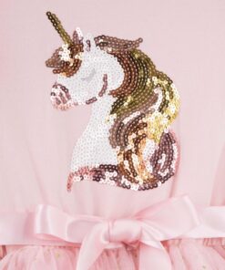 This Unicorn Sequin S/S Tutu Dress, features our exclusive unicorn sequin design, with a matching satin bow, gold sparkle tulle skirt and a pretty shoulder frill. The perfect outfit for your girl’s next special occasion.